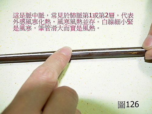 浮脈只是一種脈位,所以浮可兼多種脈象。浮滑有力是外感風熱。浮滑有力兼數是較嚴重的外感風熱。浮細緊小有力是外感風寒(小是指脈寬比正常脈窄)。浮滑有力,中有一細緊小脈,是風寒正在轉成風熱,是風寒風熱並存(〈圖126〉,參看第 44 條 脈中脈)。浮濡風濕。浮無力是虛。浮散無力是虛甚而不斂。浮澀無力是虛兼血瘀。浮大無力或氣虛或血虛(兼外症面色觀之,面色恍白偏氣虛,面色不華偏血虛)。浮細無力或陰虛或陽虛(兼外症面色觀之,面色清白帶寒偏陽虛,面色嫩紅帶熱偏陰虛)。